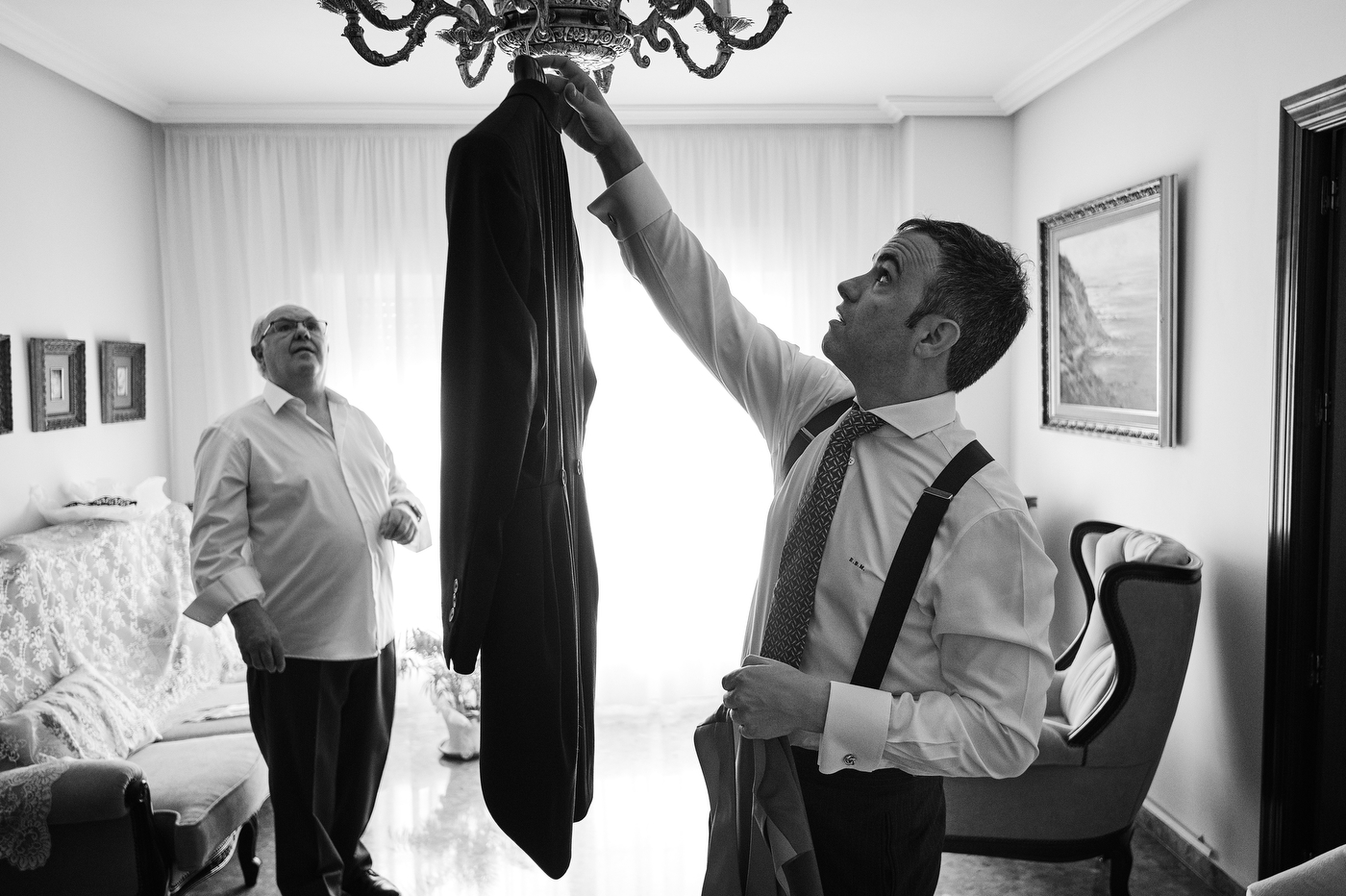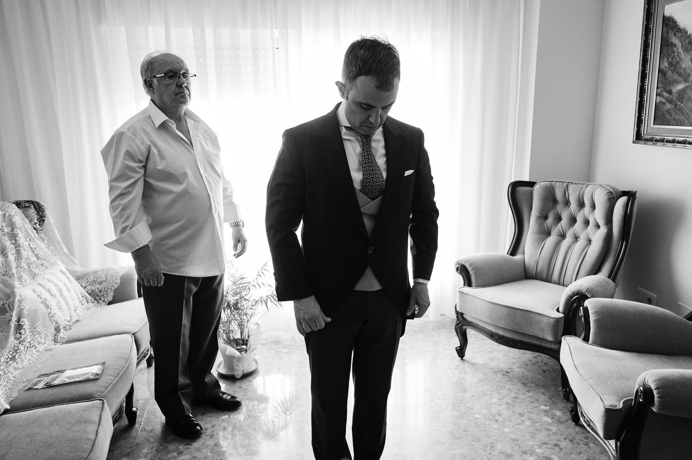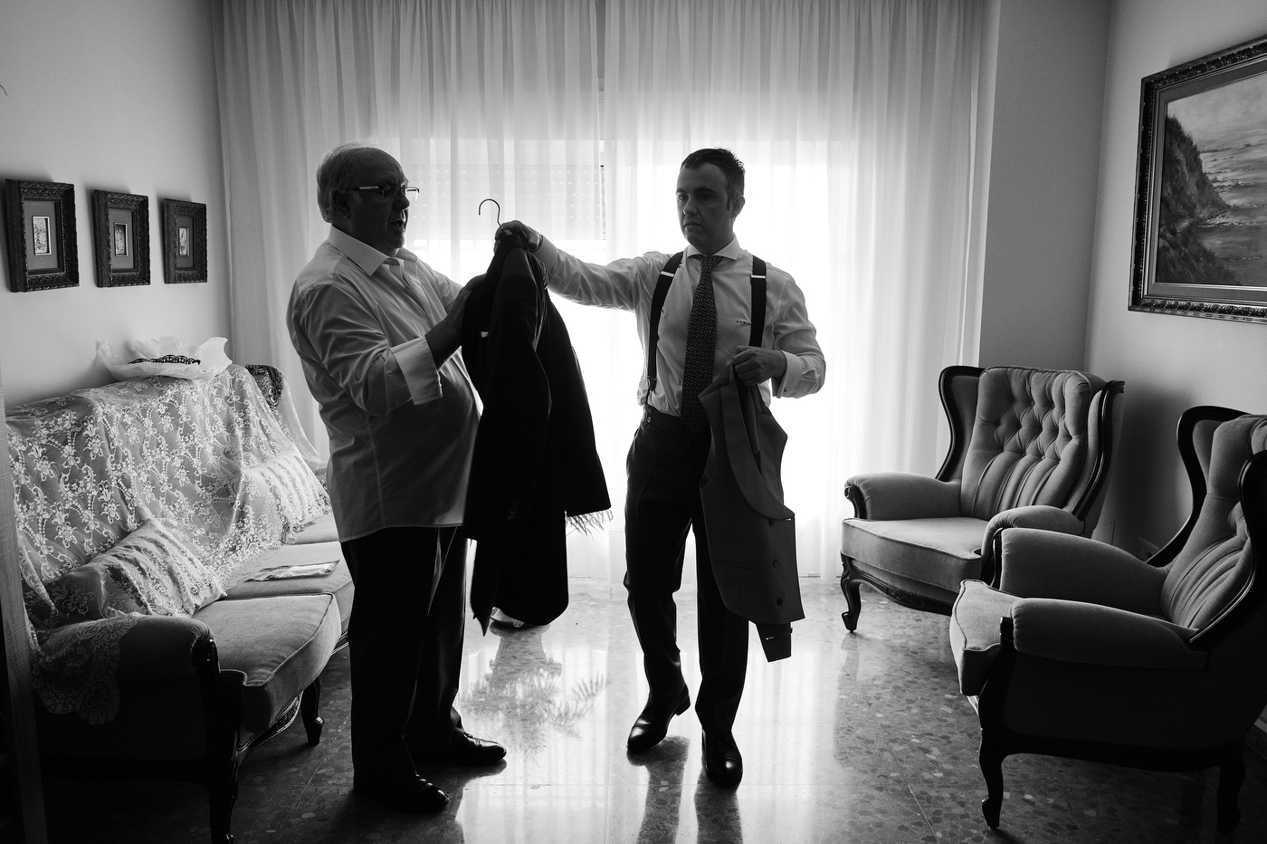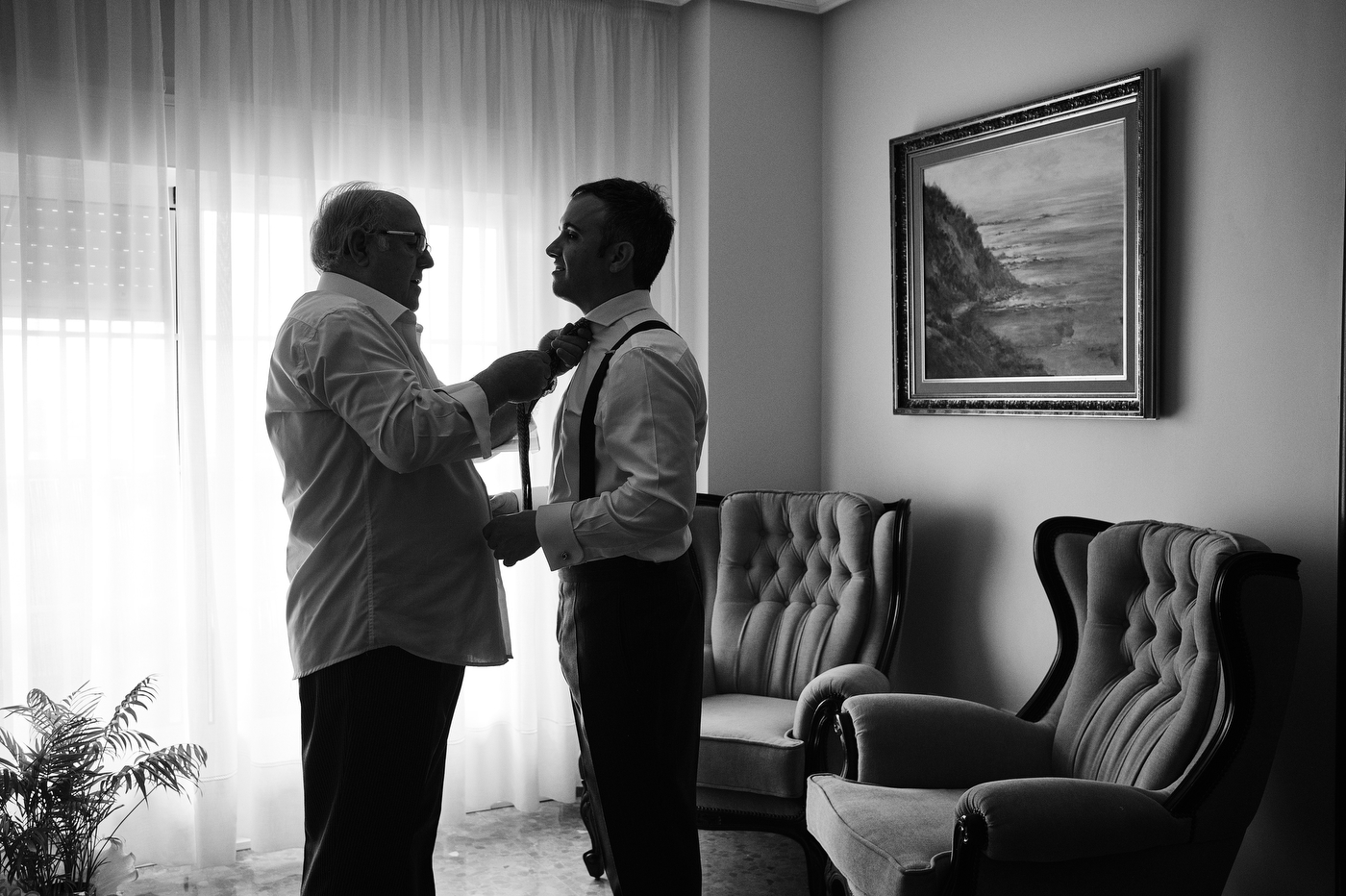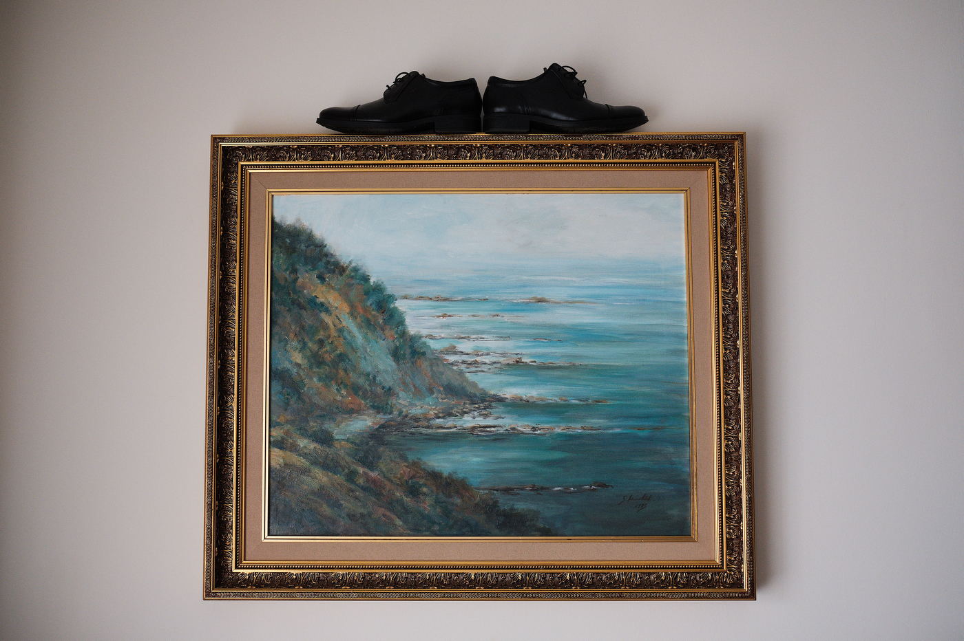 Comenzamos el día en Algeciras, lugar de residencia de nuestra pareja. Una vez ya en casa de Quique me topé con un cuadro maravilloso. Una pintura que realizó un familiar de Quique de un rincón de la costa de Algeciras, la imagen me inspiró muchísimo, sus colores, la textura, etc. Esa fue la primera fotografía que tome este día, añadí los zapatos de Quique, respiré profundamente y me sentí muy afortunado de poder trabajar haciendo esto tan bonito. Me esperaba un día grande, estaba muy feliz.