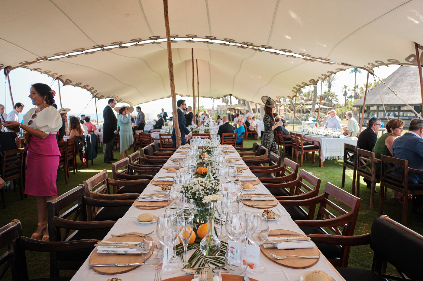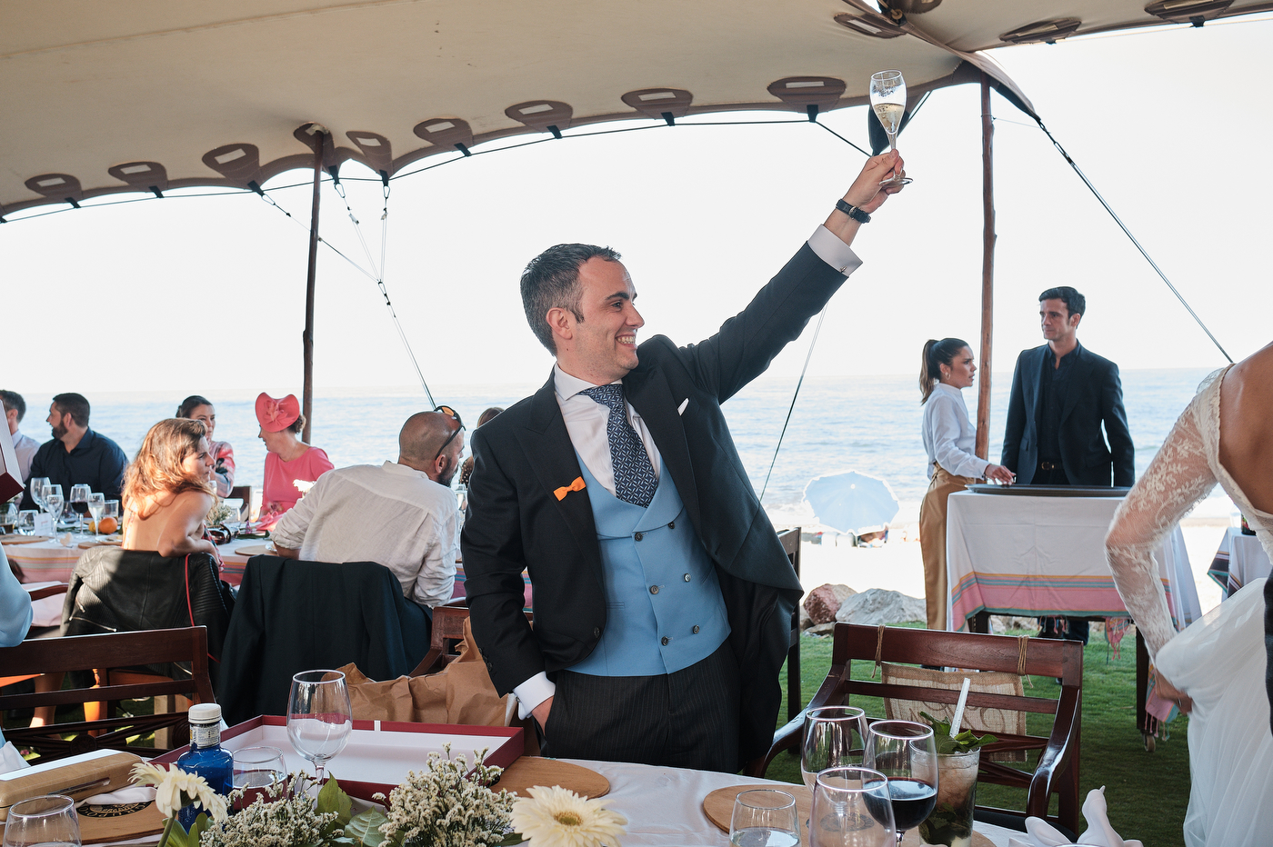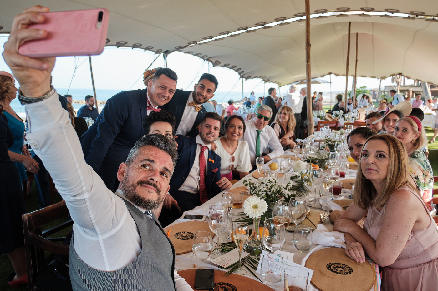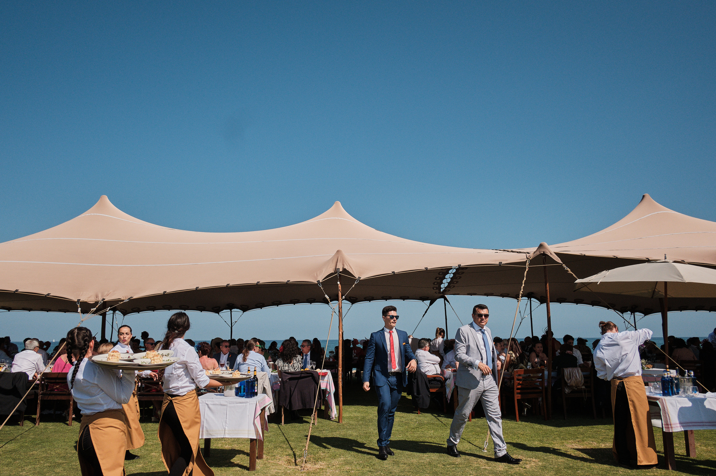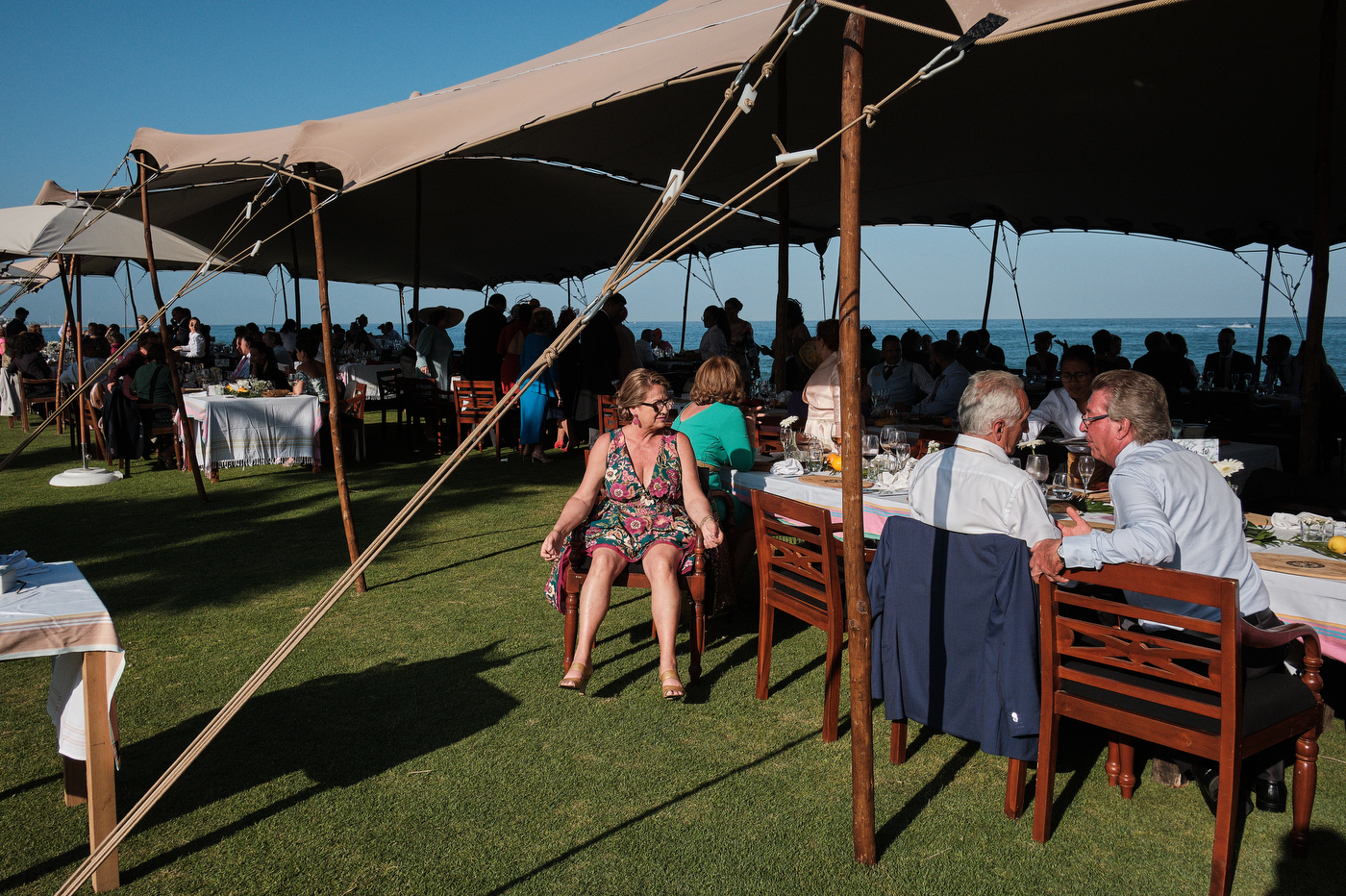 Una carpa enorme y bien instalada a tan solo unos pocos metros de la orilla del mar dio sombra a los numerosos invitados durante la comida. Al finalizar ésta todas se dirigieron a otro recinto y dio comienzo la fiesta que duró hasta altas horas de la madrugada.