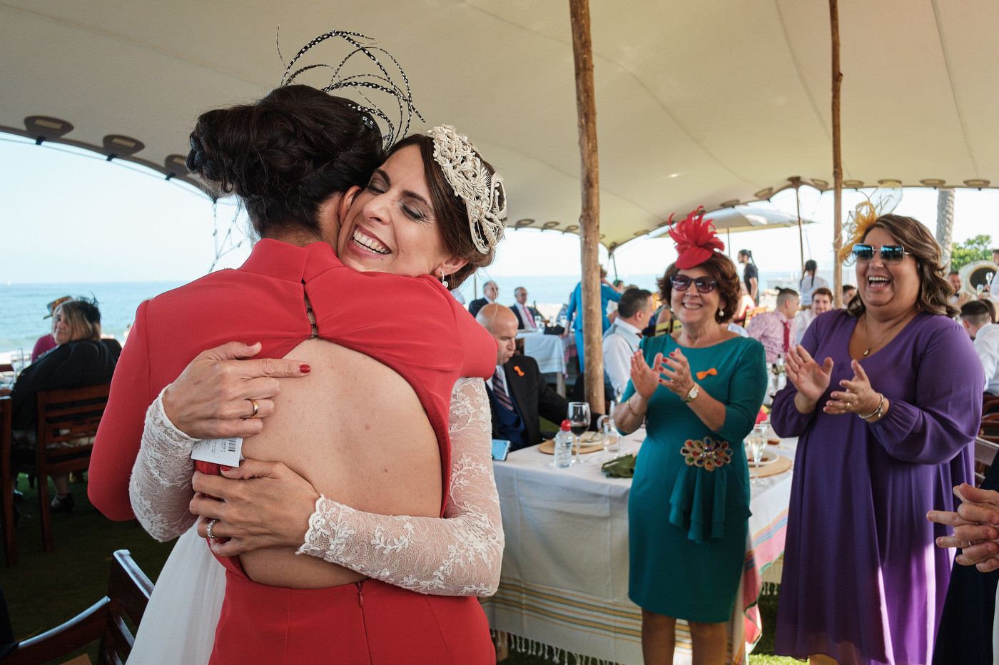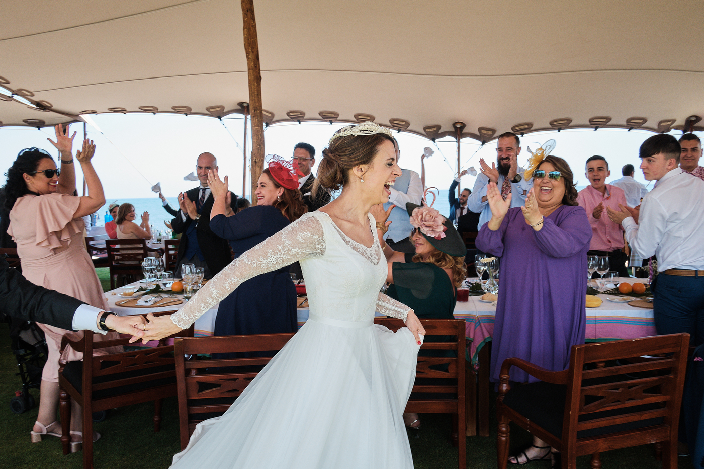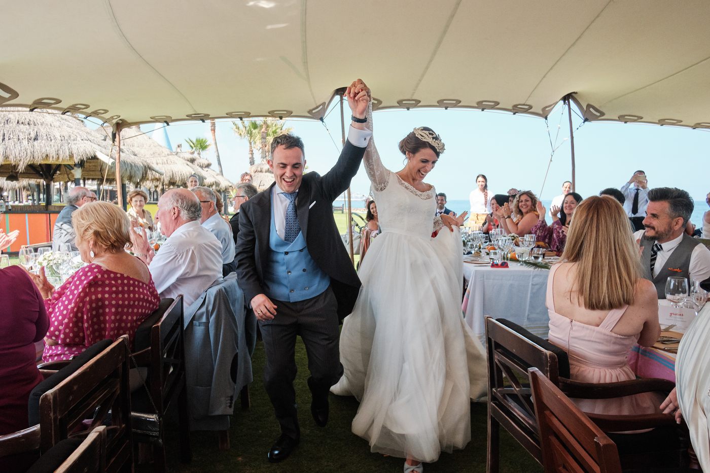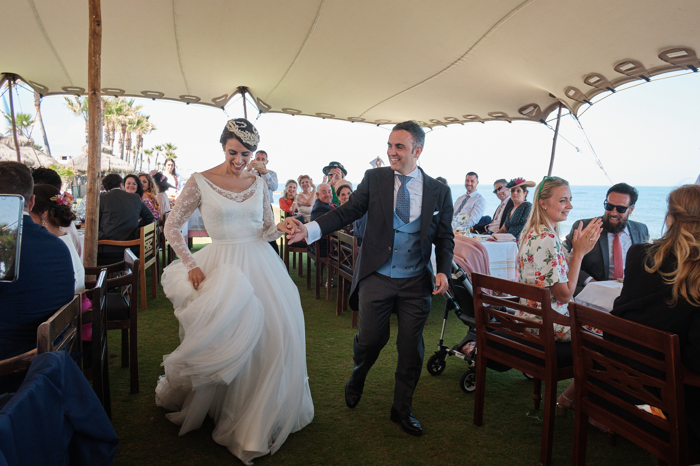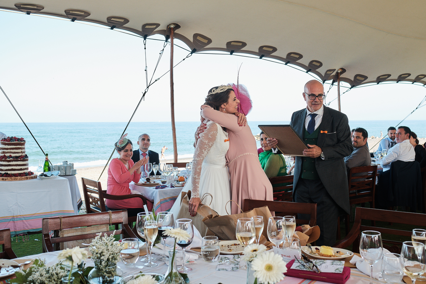 Una carpa enorme y bien instalada a tan solo unos pocos metros de la orilla del mar dio sombra a los numerosos invitados durante la comida. Al finalizar ésta todas se dirigieron a otro recinto y dio comienzo la fiesta que duró hasta altas horas de la madrugada.