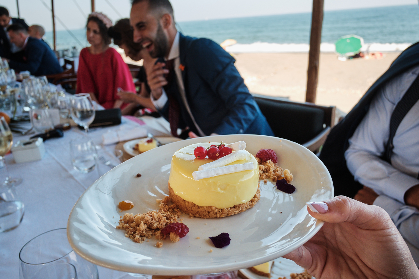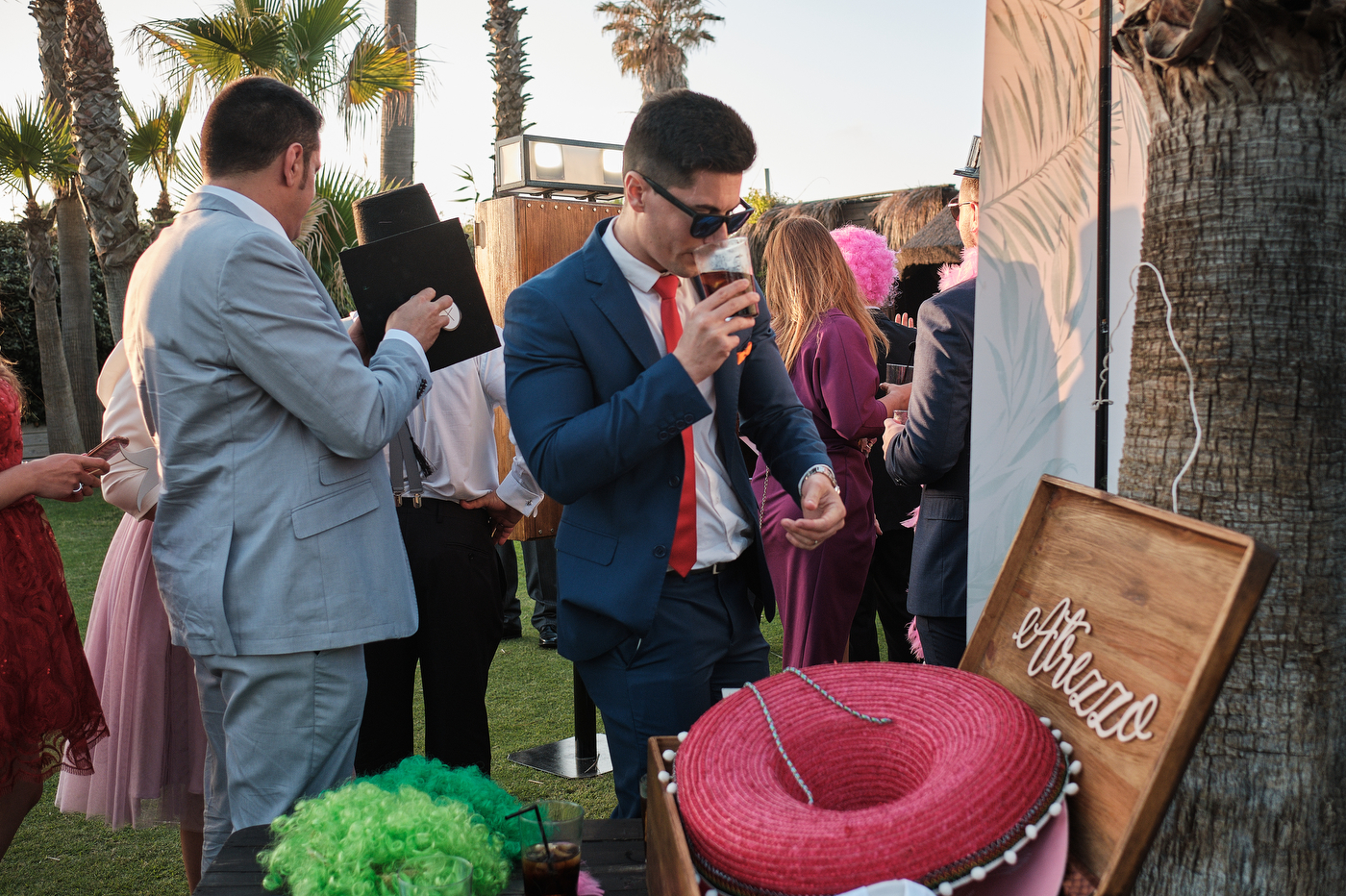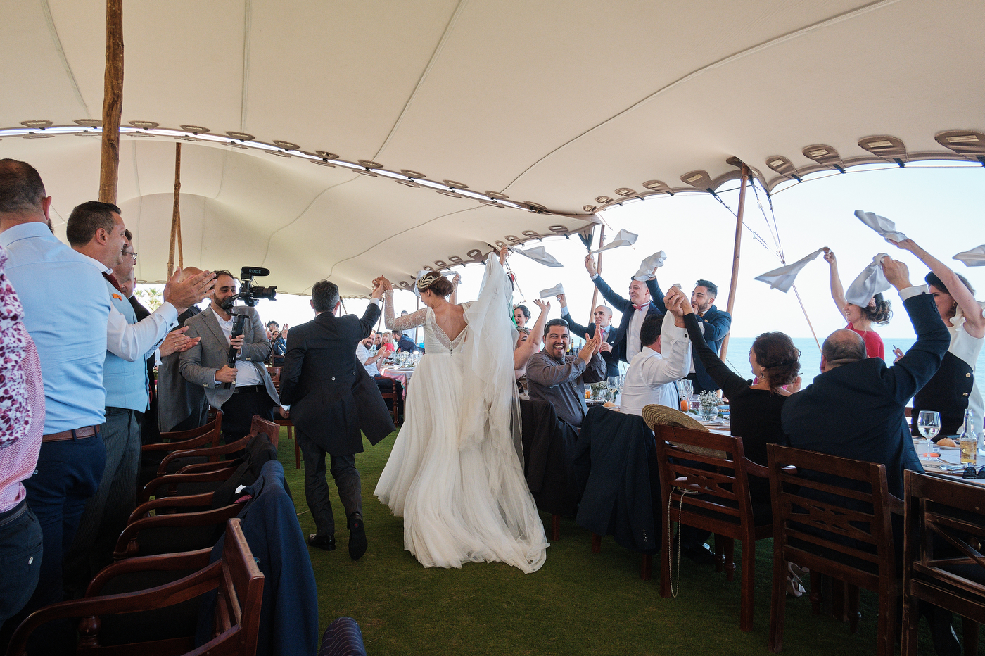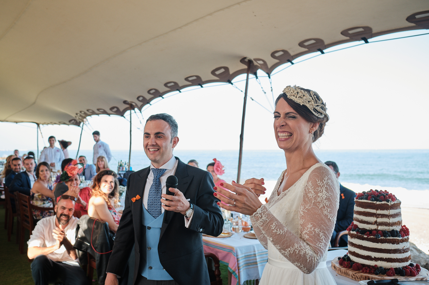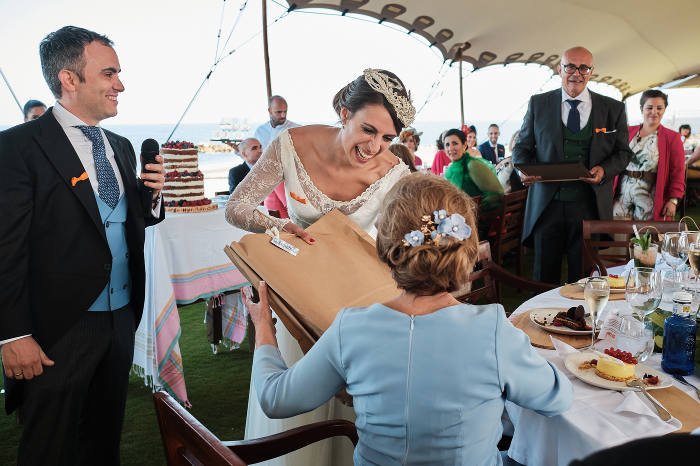Una carpa enorme y bien instalada a tan solo unos pocos metros de la orilla del mar dio sombra a los numerosos invitados durante la comida. Al finalizar ésta todas se dirigieron a otro recinto y dio comienzo la fiesta que duró hasta altas horas de la madrugada.
