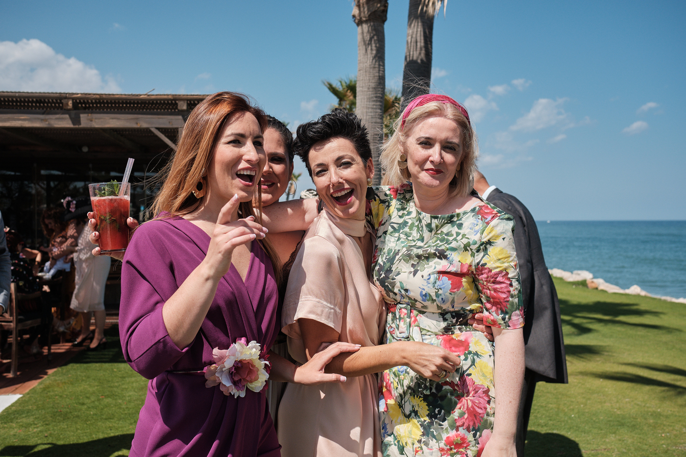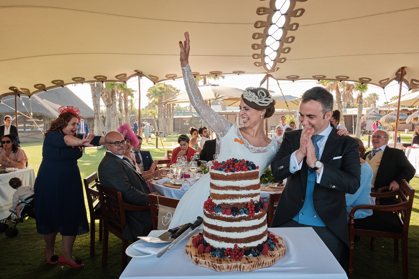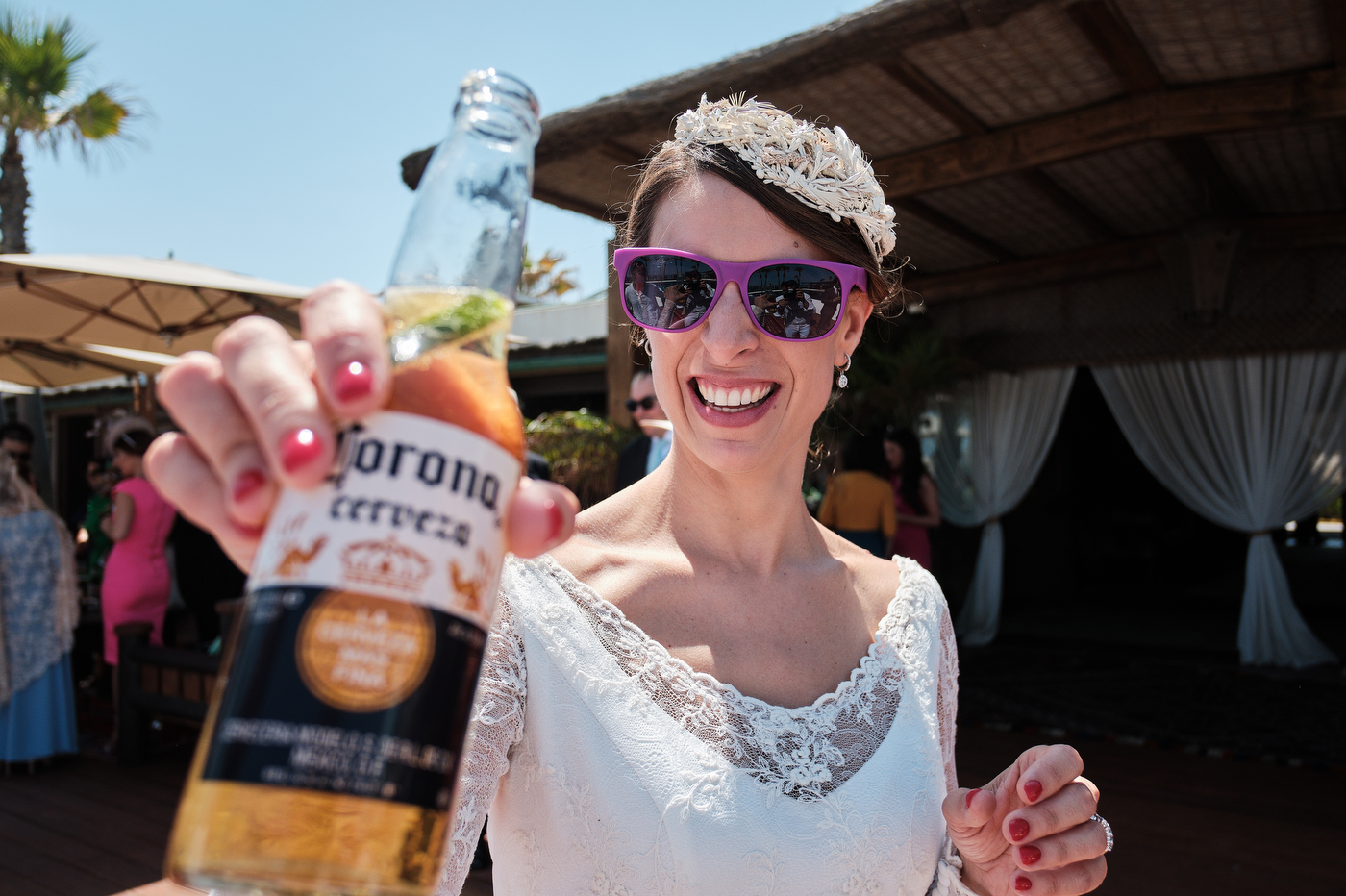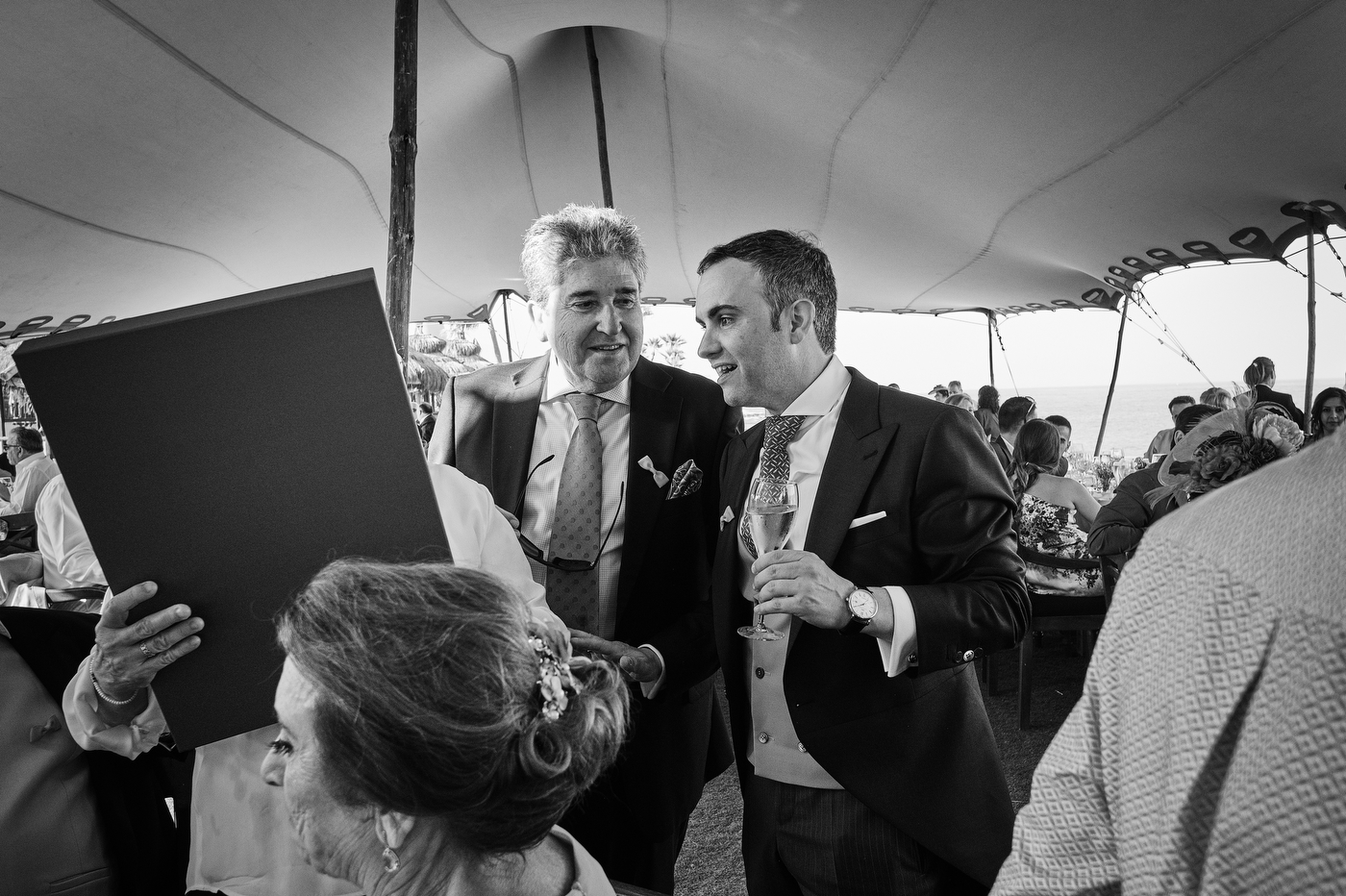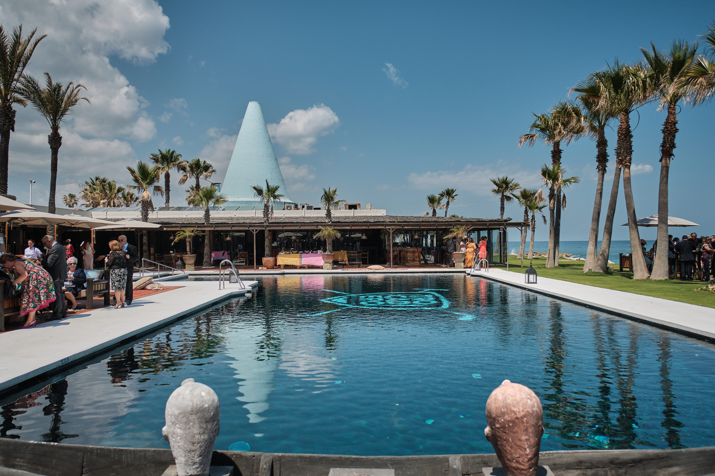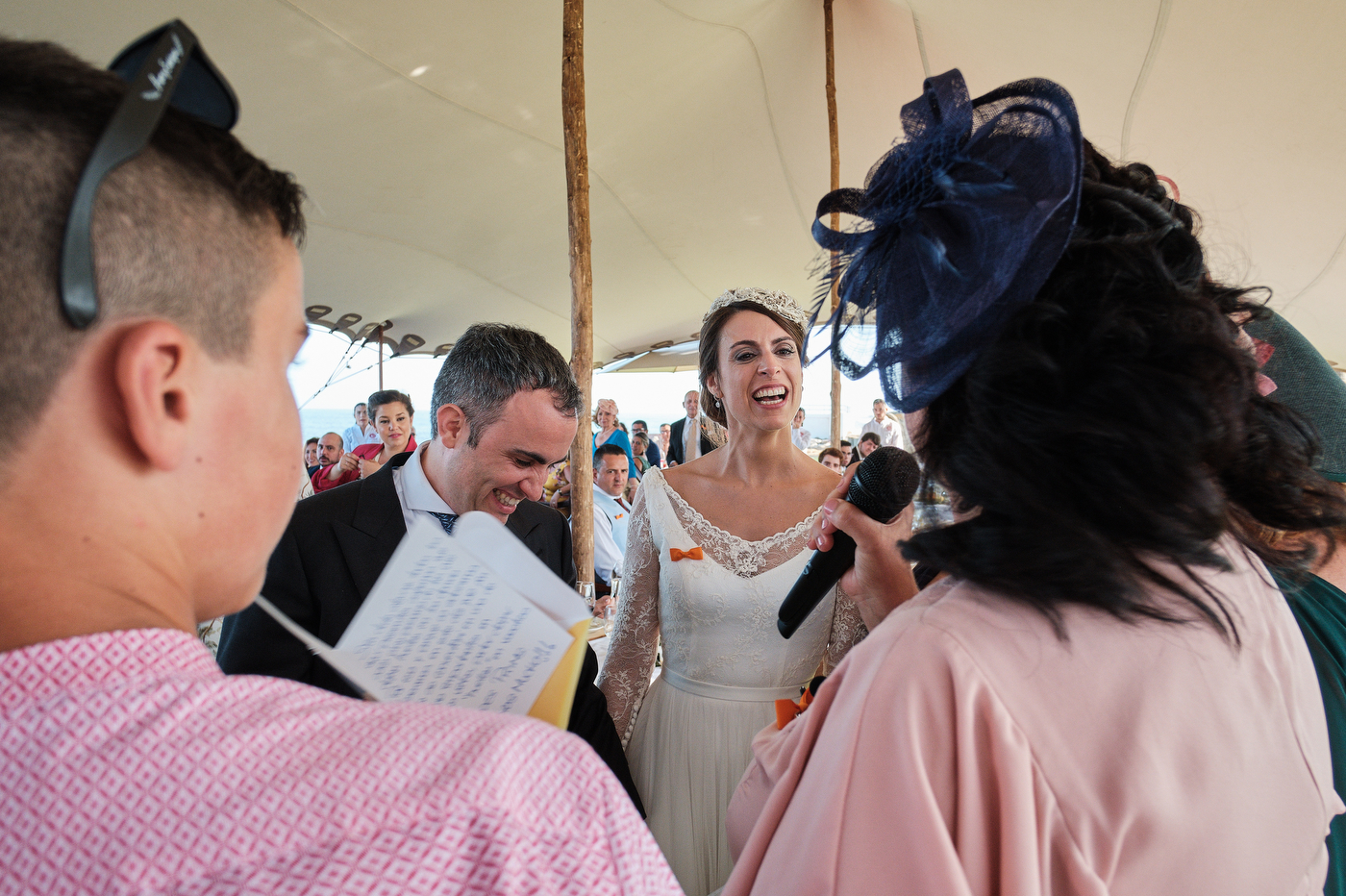 Una carpa enorme y bien instalada a tan solo unos pocos metros de la orilla del mar dio sombra a los numerosos invitados durante la comida. Al finalizar ésta todas se dirigieron a otro recinto y dio comienzo la fiesta que duró hasta altas horas de la madrugada.